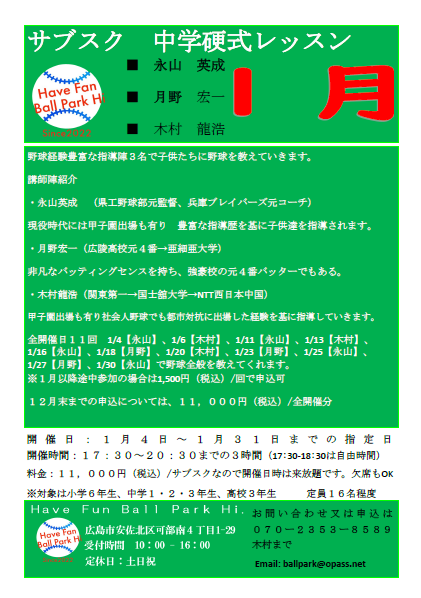 開催日:1/4~1/31までの指定日(11回) 永山 ・・・ 1/4(水)、1/11(水)、1/16(月)、1/25(水)、1/30(月) 月野 ・・・ 1/18(水)、1/23(月)、1/27(金) 木村 ・・・ 1/6(金)、1/13(金)、1/20(金) 料 金:1月以降の途中参加の場合は、1,500円(税込)/回で申込可 ※12月末までの申込については、11,000円(税込)/全開催分 対 象:小学6年生、中学1・2・3年生、高校3年生 定員16名程度 問合せ:070ー2353ー8589 木村まで (申込) Email: ballpark@opass.net |