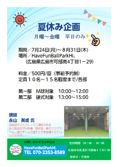 開催期間:7月24日(月)~8月31日(木) 料 金:500円(税込)/1回分 注:事前予約制 定 員:各部10~15名程度 第一部 M球対象 10:00~12:00 第二部 硬式対象 13:00~15:00 問い合せ:070ー2353ー8589 木村まで (申込) Email: ballpark@opass.net |